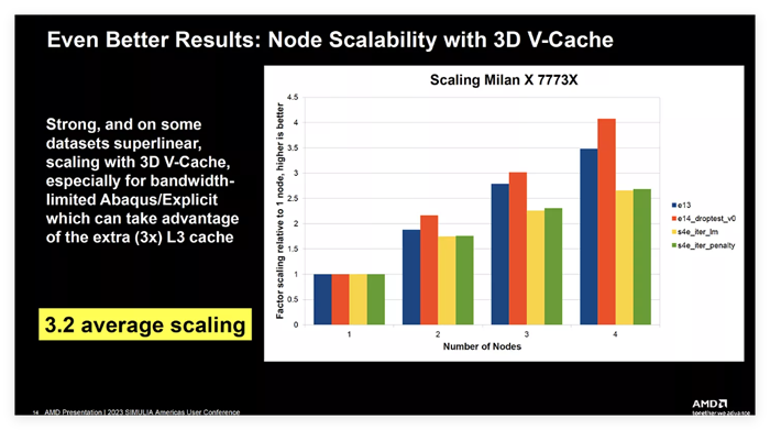 对于 Abaqus/Explicit 而言,多节点系统在处理器拥有更多 L3 缓存时扩展性更好。幻灯片由AMD 2023 年 SIMULIA 美洲用户大会演示文稿提供。
