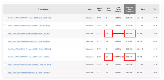 处理器核心数量和核心时钟频率(理论上)呈反比关系,因此,如果您购买的处理器核心数量远超您运行 Abaqus 所需的核心数量,那么您可能买到的是一款性能较差的处理器。请比较以下 6444Y 和 6442Y:前者拥有 16 个核心,主频为 3.60 GHz;后者则拥有 24 个核心,主频为 2.60 GHz。
